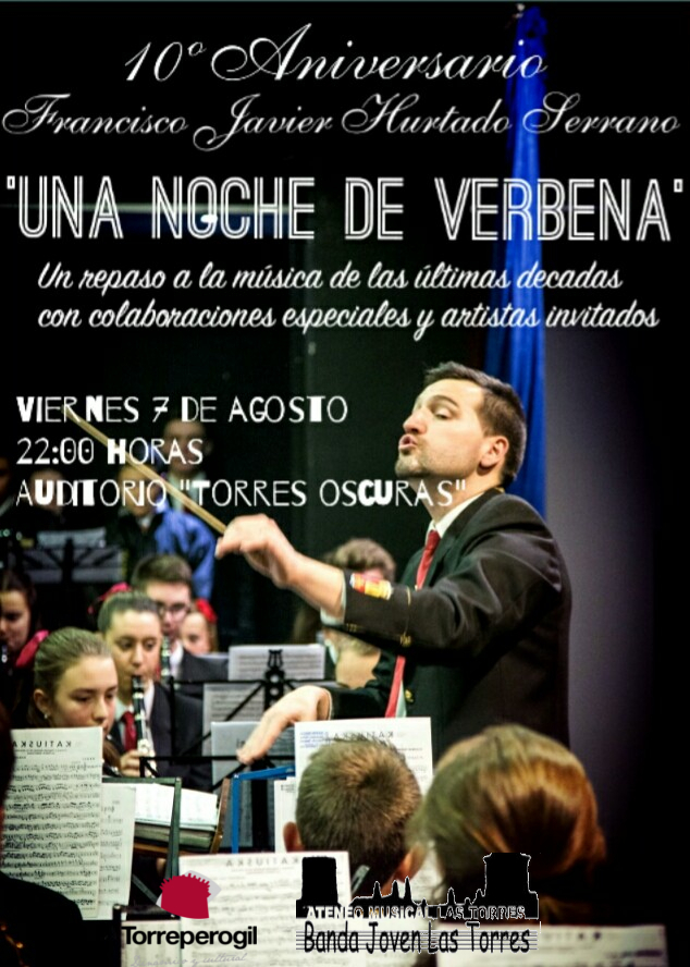 Con motivo de el X Aniversario de nuestro director Francisco Javier Hurtado al cargo de esta Asociación Musical, el próximo viernes 7 de agosto celebraremos estos diez años de éxitos y convivencia con un concierto especial. Junto a artistas invitados y colaboraciones especiales, daremos un repaso a la música de las últimas decadas y homenajearemos a nuestro director por la magnífica labor hasta la actualidad. Te esperamos el viernes 7, a las 22:00 en el Auditorio Municipal 'Torres Oscuras'.